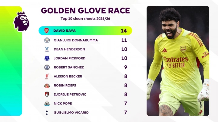 英超金手套奖最新排名: