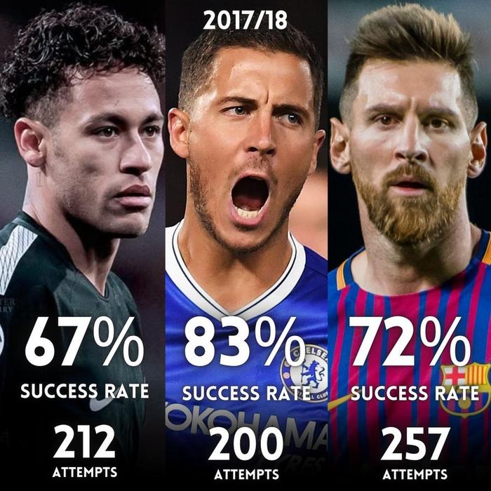巅峰时期的阿扎尔比内马尔和梅西的盘带技术更出色。