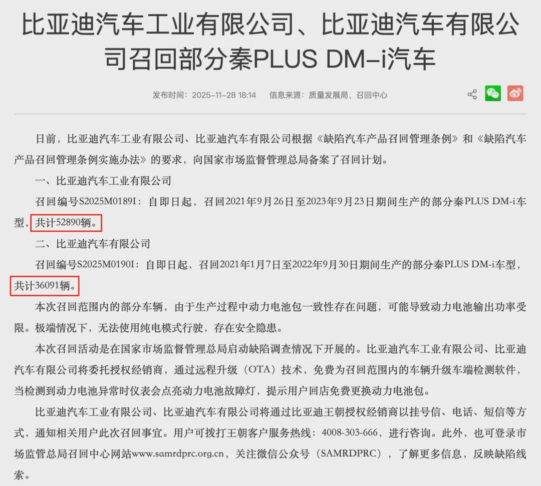 2025年11月,在国家市场监督管理总局启动缺陷调查后,比亚迪汽车工业有限公司及比亚迪汽车有限公司宣布被动召回部分秦PLUSDM-i车型,召回总量达88981辆,这一事件再次将其质量问题推至公众视野。